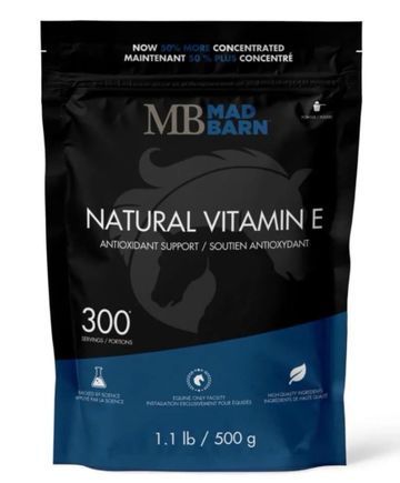 Mad Barn Natural Vitamin E provides supplemental Vitamin E for horses. This pure Vitamin E supplement contains no fillers. Vitamin E provides antioxidant support for cardiovascular health, and normal muscle function following exercise. This supplement also promotes healthy immune system function and healthy neurological function.