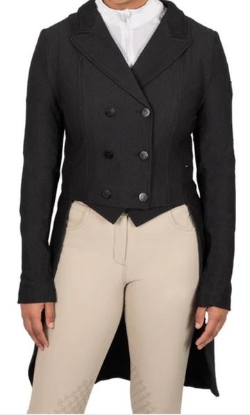 The Elation Platinum Tosca Shadbelly Show Coat combines function and style, suitable for the competition ring. Constructed with a mesh design, the Tosca Shadbelly offers 4-way stretch and breathability for added comfort on the warmest of show days. Features princess seams on the front and back for a flattering fit, and traditional double breasted button closures with removeable points. Machine washable for easy convenience between shows. Black
