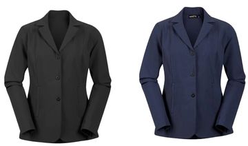 This all-season show coat may be the easiest thing about competing. Simply pull on an elegant, stain and weather-resistant silhouette that breathes and stretches in the saddle, then toss it in the wash for next time. No ironing. No worries. Strategic, contoured design flatters a range of body types. Hidden front zip with snaps stays smooth for a streamlined silhouette. Eyelets at waist secure riders’ number strings. Black and Navy